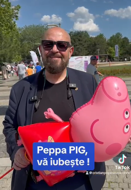 „Vom mai fi în Parcul Copiilor, în parcul Herăstrău, în Orășelul Copiilor, în parcul Operei, peste tot unde această minunată asociație s a gândit să facă din ziua internațională a copiilor o zi fericită. Acest personaj Peppa PIG m a asimiliat și această asociatie m-a invitat pentru că atunci când mi -am anunțat intenția de a candida la Primărie un alt contracandidat al meu mi a pus ștampila de Peppa PIG. Mulțumesc încă odată acestei asociatii”, este mesajul transmis de Popescu Piedone.
