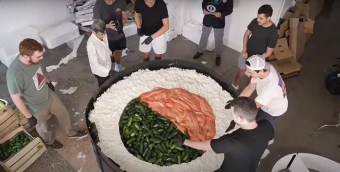 Ruloul a fost gătit cu următoarele ingrediente: 2.000 de kilograme de orez, 500 de kilograme de somon, 500 de kilograme de castraveți și milioane de semințe de susan