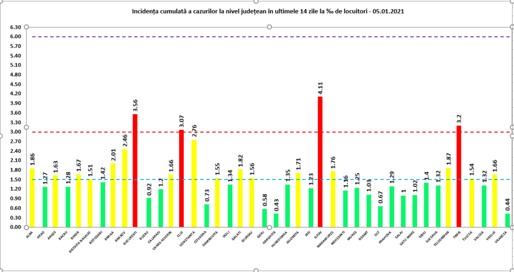 La nivelul României, nu mai este niciun județ cu incidența cumulată în ultimele 2 săptămâni de peste 5 la mie. Ilfovul are, în urma raportării de marți, coeficientul de 4,11 la mie, în scădere față de luni, iar trei județe sunt între 3 și 4 la mie: București – 3,56, Cluj – 3,07 și Timiș – 3,2. Șase județe au acest coeficient sub unitar: Buzău – 0,92, Covasna – 0,73, Gorj – 0,58, Harghita 0,43, Olt – 0,67 și Vrancea – 0,51 la mia de locuitori.