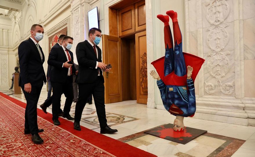 Superman, picat în cap. Imaginea zilei vine astăzi de la Parlament, pe holurile căruia social democrații și-au scos din desagă tot spiritul artistic de care dispun și au montat o statuie ce îl înfățișează pe Superman, picat în cap, într-o baltă de sânge.