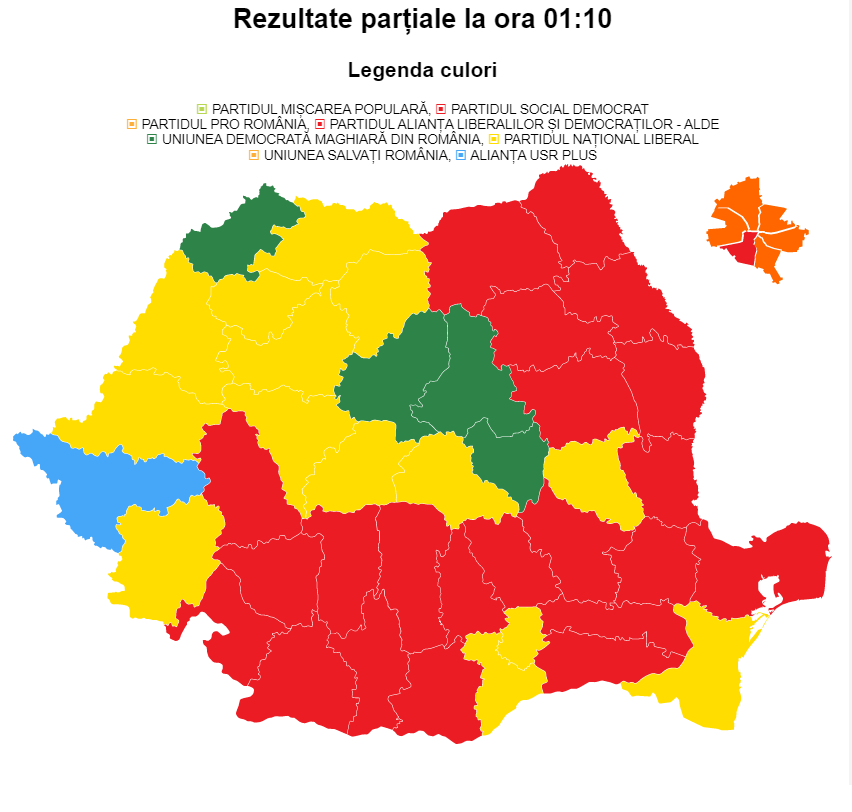 PSD – 30%, PNL- 24,9%, USR PLUS – 14%, UDMR – 6,4%, surpriza scrutinului este AUR – 8,6%,