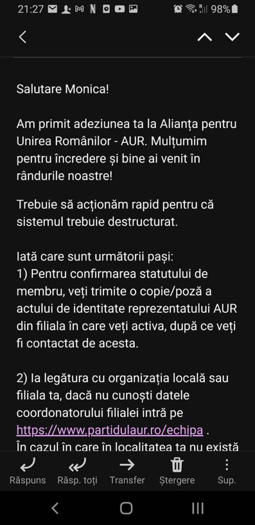 Fostul politician Monica Tatoiu povestește, într-un mesaj postat pe pagina acesteia de socializare, că ar fi primit de curând un sms de la cei de la AUR, în care i se explica, cu subiect și predicat, ce trebuie să facă pentru a deveni membru de partid. Poate și mai interesant este faptul că sms-ul este unul personalizat, în care AUR i se adresează pe numele mic („Salutare Monica”), semn că numărul acesteia de telefon a fost cumpărat de la terți, drept pentru care Monica Tatoiu anunță că de-acum încolo va deveni mai vigilentă în ceea ce privește abaterile de la normele GDPR.