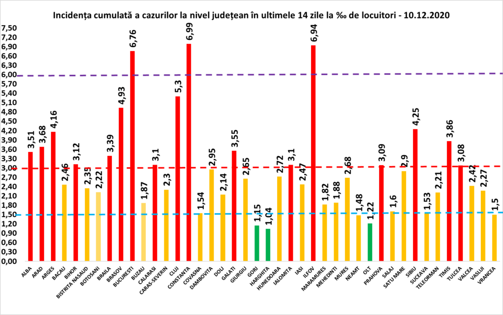 Astfel, Bucureștiul se află la 6,76 la mie, iar alte două județe sunt chiar sub „linie”, Constanța are 6,99, iar Ilfovul, 6,94. Brașovul a coborât sub 5, înregistrând incidența de 4,93, iar Clujul a coborât până la 5,3, de la 5,45 la mie. Trei județe (Gorj, Harghita și Olt) se află pe „verde”, cu indicele sub 1,5 la mia de locuitori.