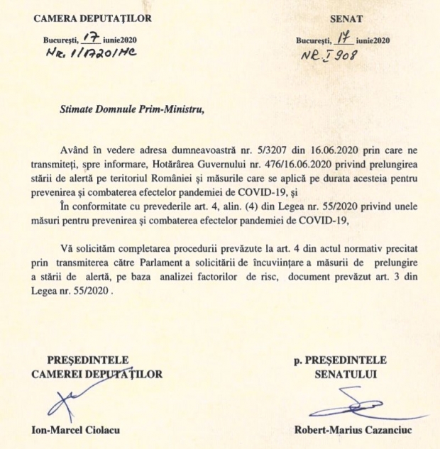 Vă solicităm completarea procedurilor de aplicare a art. 4 din actul normativ precitat prin transmiterea către Parlament a solicitării de încuviințare a măsurii de prelungire a stării de alertă, pe baza analizei factorilor de risc, document prevăzut la art. 3 din Legea nr. 55/2020”, scrie Marcel Ciolacu în scrisoarea adresată prim-ministrului Ludovic Orban.