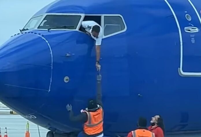 Southwest Airlines a postat un videoclip pe Facebook în care îl arată pe căpitanul zborului atârnând, practic, pe fereastra cabinei.