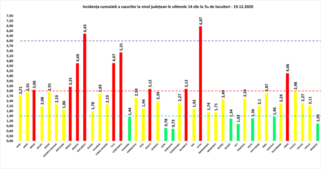 Județul Ilfov și Bucureștiul sunt singurele județe cu incidența cumulată în ultimele 2 săptămâni de peste 6 la mia de locuitori, cu 6,87, respectiv 6,43.