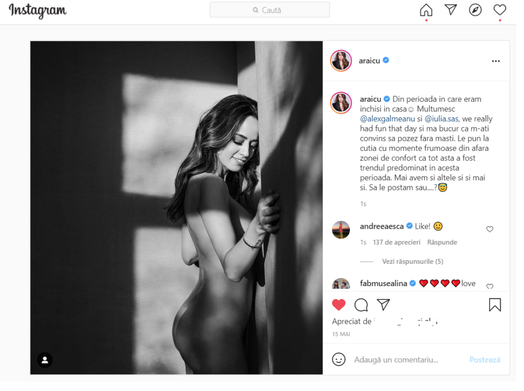 În urmă cu câteva luni, Andreea Raicu a povestit cum de a ales totuși să pozeze un nud artistic. Perioada în „eram închiși în casă” le-a pus multora creativitatea la treabă, dacă unii s-au ocupat de redecorări, ordine prin garderobă, Andreea a pozat. Inițial voia să păstreze fotografia, un nud artistic, în „cutia cu momente frumoase din afara zonei de confort”, pentru a-şi aminti la 80 de ani cât de bine arăta la 40. Însă Andreea Raicu a avut curajul să o „arunce” pe Instagram, unde pe lângă zecile de mii de aprecieri a primit și mii de comentarii, în care pe cât de încurajată a fost, pe atât de criticată.