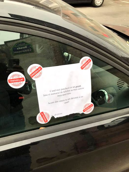 Un șofer din București s-a ales cu roțile sparte și cu un mesaj nu tocmai prietenos, după ce și-a parcat mașina pe locul altui șofer: “Când mai parchezi ca un prost, lasă și numărul de telefon să mai cunosc încă unul nou. Acum din cauza ta, am devenit și eu unul! Semnat: alt prost!”.