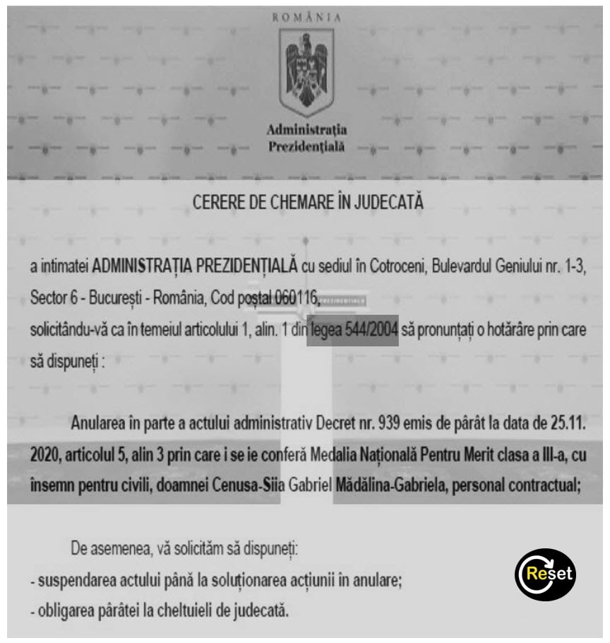 „Reset a solicitat Administrației Prezidențiale să retragă Medalia Națională pentru Merit clasa a III-a, cu însemn pentru civili, doamnei Cenușă-Sîia Mădălina Gabriela”, apare în postarea pe Facebook a Asociației Reset.
