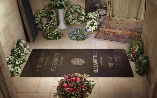 Pe piatra din marmură neagră belgiană sunt trecute numele reginei Elisabeta II (1926-2022), prinţului consort Philip (1921-2021), dar şi a părinţilor reginei Elisabeta II, regele George VI (1895-1952) şi Elisabeta (1900-2002). Noua piatră funerară o înlocuieşte pe cea cale dedicată regelui George VI şi reginei mamă. Regina Elizabeth II a fost înmormântată, luni, alături de soţul ei, Prinţul Philip, la Capela Memorială Regele George VI de la Castelul Windsor.