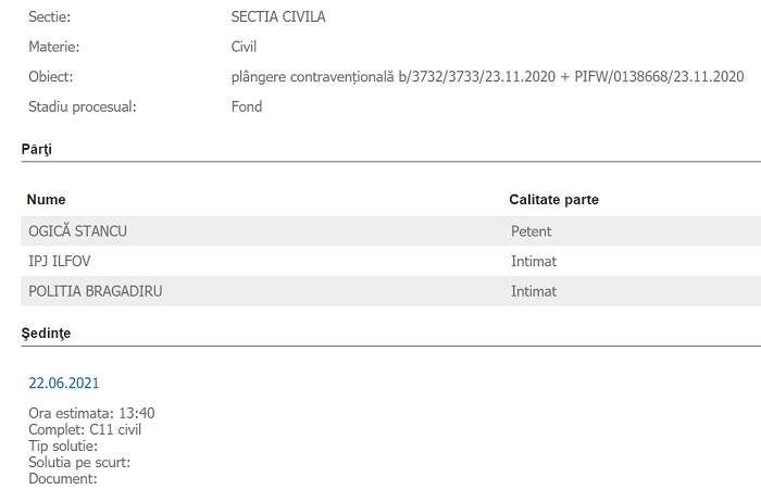 Pe larg, Stelian Ogică e tare nemulțumit din pricina unei sancțiuni contravenționale pe care a primit-o în data de 23 noiembrie 2020, aplicată de Poliția din Bragadiru. Așadar, „starul loteriei” a decis să-și caute dreptatea în instanță, după cum se poate vedea și în imaginea de mai jos: