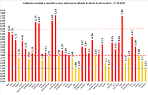 Pentru a treia zi consecutivă, incidența cumulată din ultimele 14 zile, la nivelul județului Sibiu, se află sub cota de 8 la mia de locuitori, mai exact 7,49, în scădere de la 7,63 cât a fost la raportarea de miercuri. Peste 7 la mia de locuitori se află județul Constanța, cu 7,54, în timp ce Brașov are 6,79, București – 6,63, iar Cluj – 6,89 la mie. 16 județe sunt pe „galben”, cu indicele sub 3 la mia de locuitori.