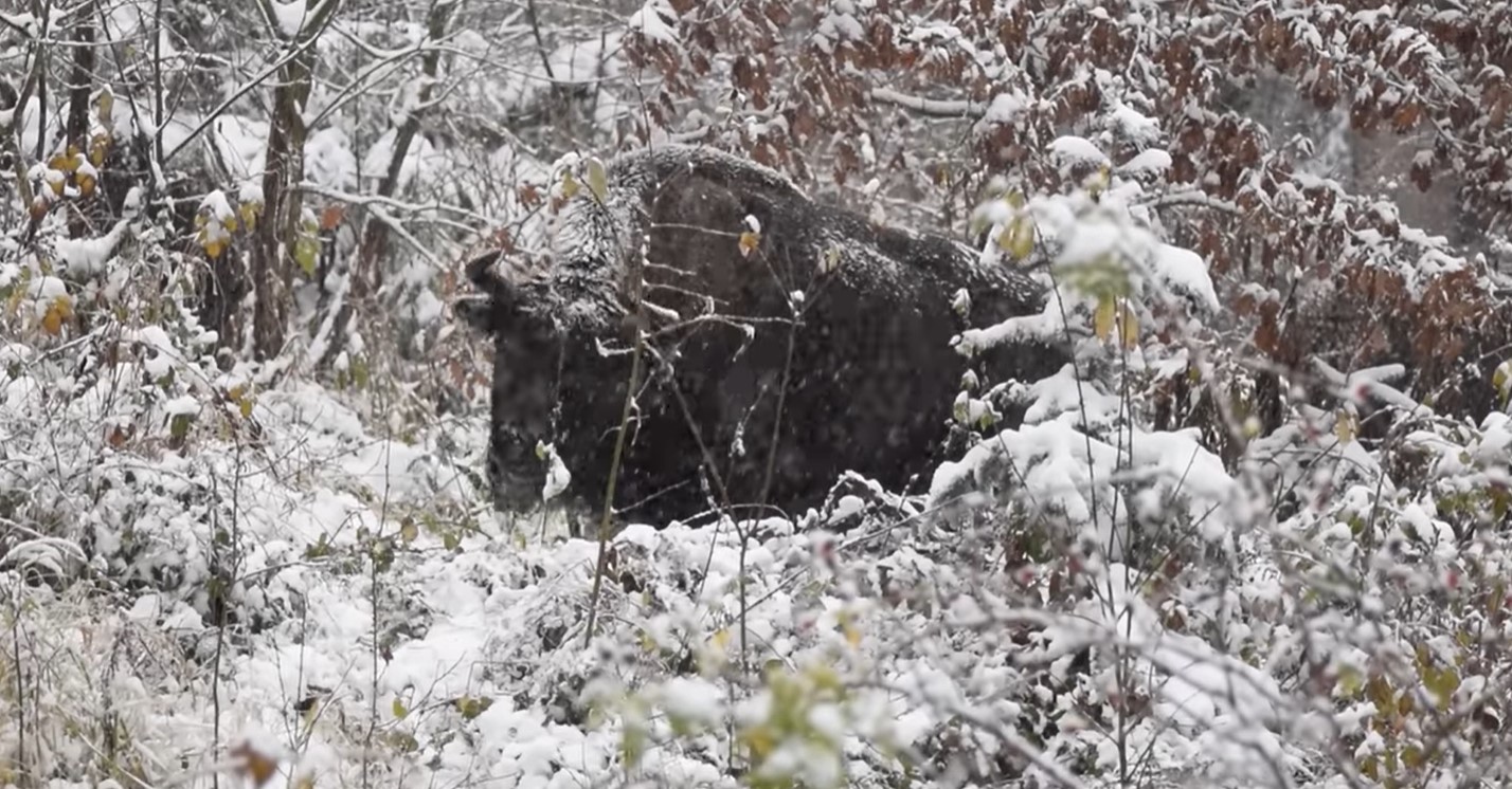 Romsilva: ”Un zimbru impunător se hrănește într-o pădure din Parcul Natural Vânători din Neamț”