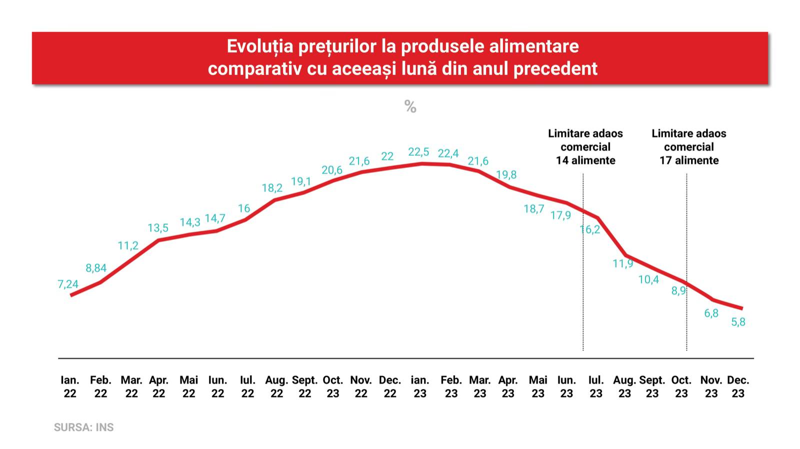 Premierul menționează că, conform datelor INS, prețurile din luna decembrie 2023 au fost cu 5.8% mai mari față de cele din decembrie 2022, în luna iunie 2023 (înainte de introducerea acestei măsuri)